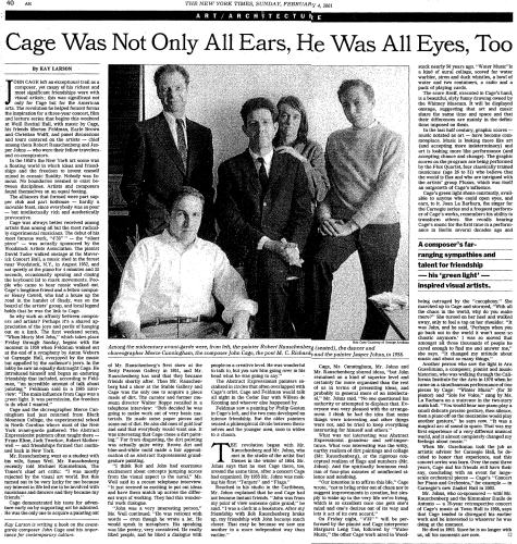 John Cage left an exceptional trail as a composer, yet many of his richest and most significant friendships were with visual artists; this was significant not only for Cage but for the American arts. The revolution he helped foment forms the inspiration for a three-year concert, film and lecture series that begins this weekend at Weill Recital Hall, with music by Cage, his friends Morton Feldman, Earle Brown and Christian Wolff, and panel discussions and tours centered on the artists — chief among them Robert Rauschenberg and Jasper Johns — who were their fellow travelers and co-conspirators.